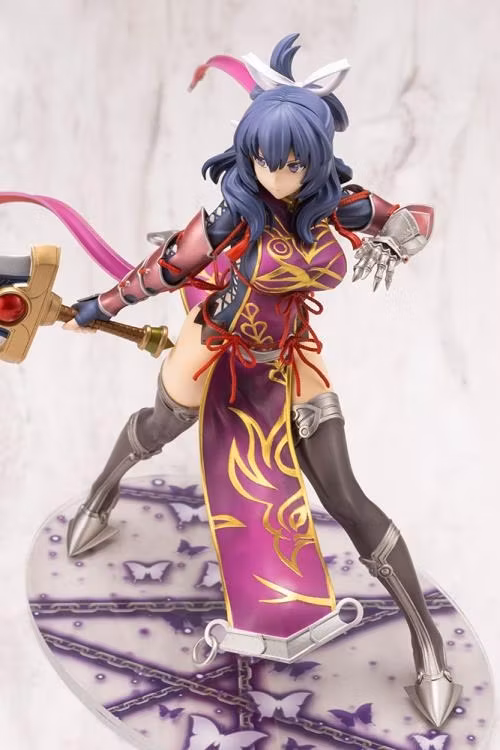 Remaining faithful to the game, she comes to life boldly wielding her giant sword effortlessly in one hand. Wearing a gorgeous Eastern-inspired outfit, her beauty and strength combine to make the perfect finish for this masterpiece. The base is painted with the chains and butterflies she uses in battle, which adorn the figure beautifully.