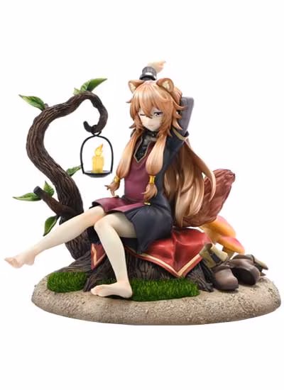Den här figuren skildrar förtjusande Raphtalia när hon sitter på en stubbe och tar av sig stövlarna när hon sträcker sig högt i en avslappnad pose under en kväll med levande ljus på sin resa med Naofumi.