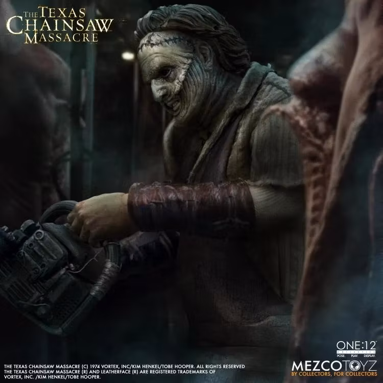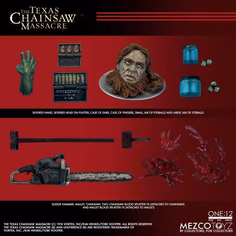 Från The Texas Chainsaw Massacre (2003) fångar One:12 Collective Leatherface den iskalla skräcken hos familjen Hewitts mest ökända slaktare. Han står redo med sin motorsåg och en rad ohyggliga bevis, bland annat en ruttnande avhuggen hand, samlade fingrar i en låda, mänskliga öron, två burkar med ögonglober och ett halshugget huvud på ett silverfat.