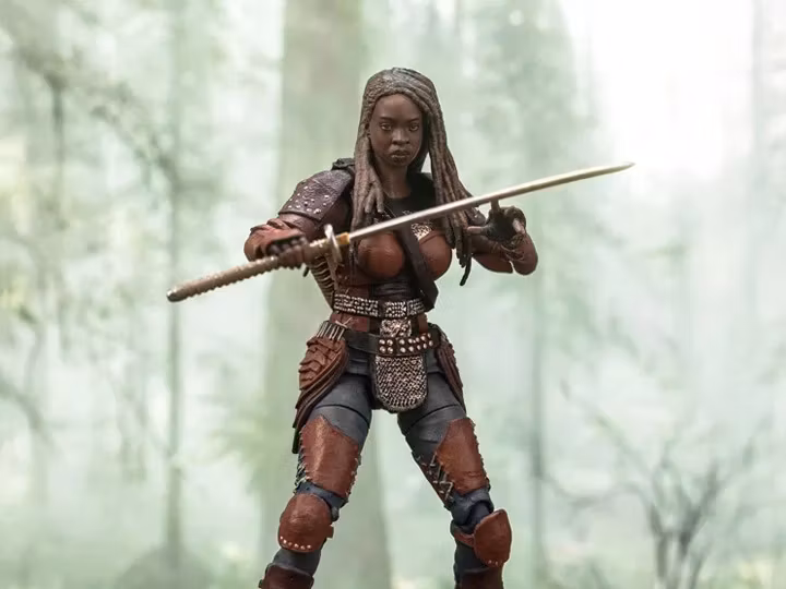 Utrustad med hennes signaturkatana, stridskäpp, walkie-talkie och mer, är varje tillbehör fint utformat i skala 1/18. Figuren har flera ledade punkter och innehåller två utbytbara handdelar, vilket gör det möjligt för fansen att posera Michonne i dynamiska, stridsklara ställningar.