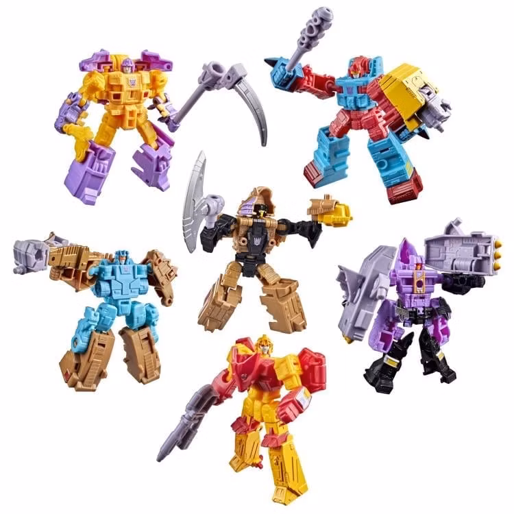 Set comes with six 3.5-inch (8.5 cm) monster robot figures: Monster Birdbrain, Monster Bristleback, Monster Icepick, Monster Scowl, Decepticon Slog, and Monster Wildfly. Combine all 6 to create Decepticon Monstructor, the imposing super warrior who stands at 6.5 inches (16.5 cm) tall.