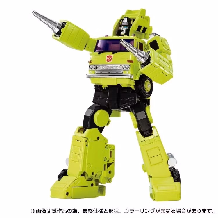 Road Hauler transforms from a crane truck with distinctive Buildron colors into a robot! The tip of the crane can be replaced with a grapple or bucket attachment. The crane part can move up and down, and the outriggers on the sides of the vehicle can be pulled out and placed on the ground. An interchangeable grill with an anime theme is included. In addition to the standard round head, the head can also be replaced with a square head that pays homage to the toys of the time, and each comes with its own dedicated interchangeable face. Nozzle-shaped parts are stored inside both arms, allowing the vehicle to transform from fist form.