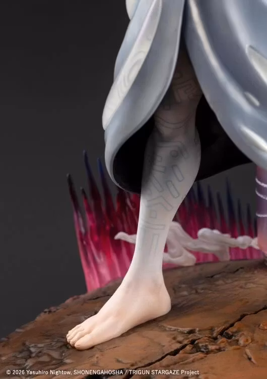 Från animen TRIGUN STAMPEDE framträder Millions Knives som en skalfigur. Figuren fångar en pose som utstrålar en överväldigande närvaro, med en kall blick som ser ner på mänskligheten. Den karakteristiska manteln är delvis gjuten med klara material och avslutas med pärlfärg, vilket skapar en livfull och djup textur. De växtmönster som framträder över hela kroppen återges också noggrant ner till minsta detalj.