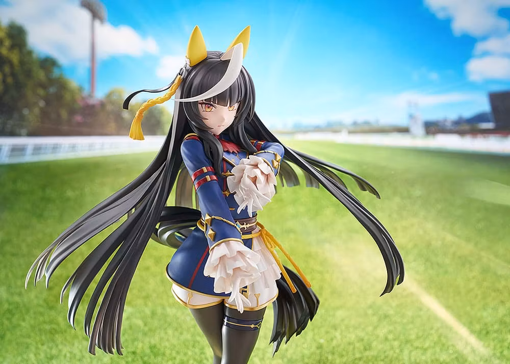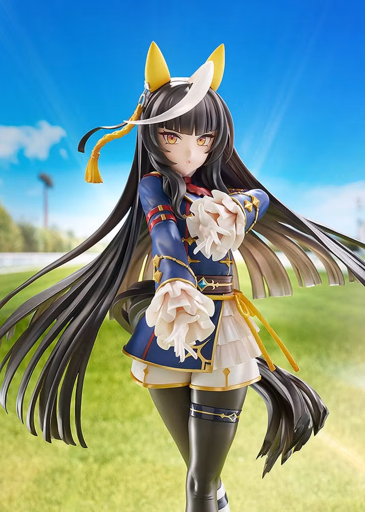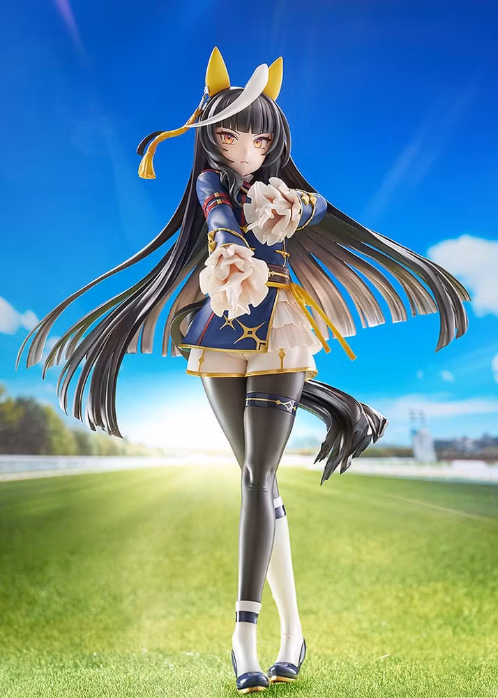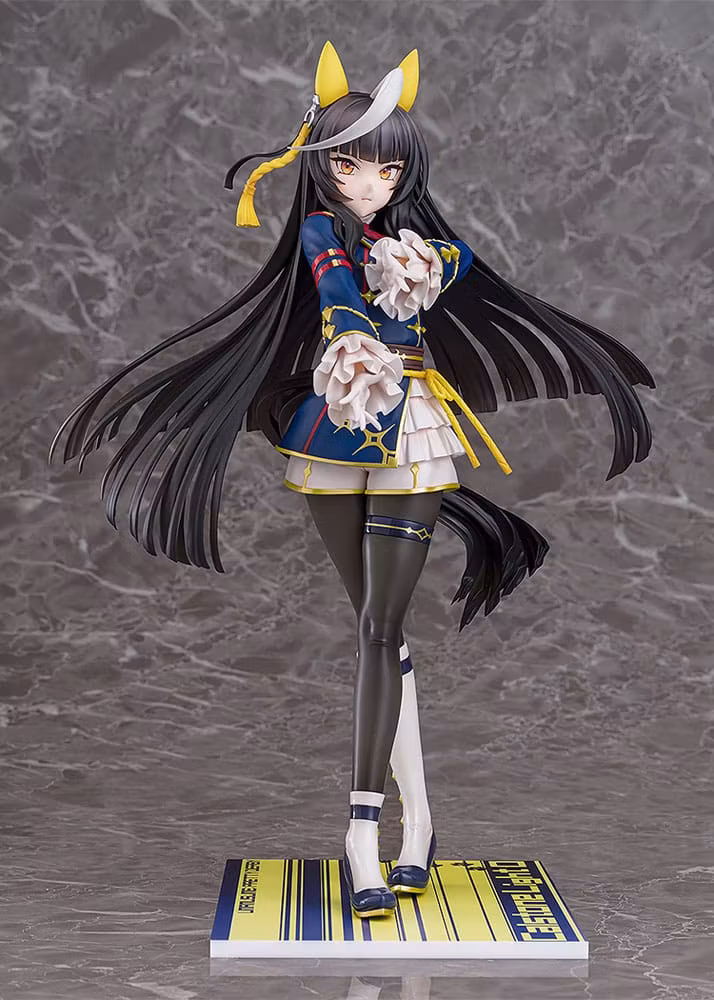 From the game Umamusume: Pretty Derby comes a 1/7 scale figure of Calstone Light O! Dressed in her Clear-Cut Conviction racewear, Calstone Light O has been sculpted with a dignified pose. Details of her design, such as her jacket and skirt frills, long, jet-black hair, sharp gaze, gestures and physique have all been faithfully reproduced in figure form. The angular base, inspired by Calstone Light O's love for straight lines, also adds an appealing touch to the figure. An interchangeable serious face plate for displaying Calstone Light O in her victory pose is also included. Be sure to add her to your collection!
