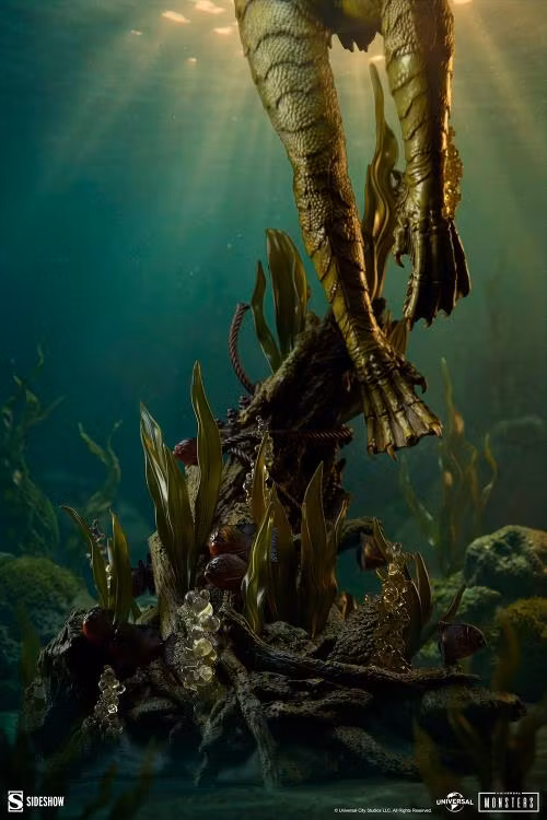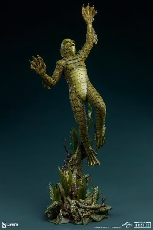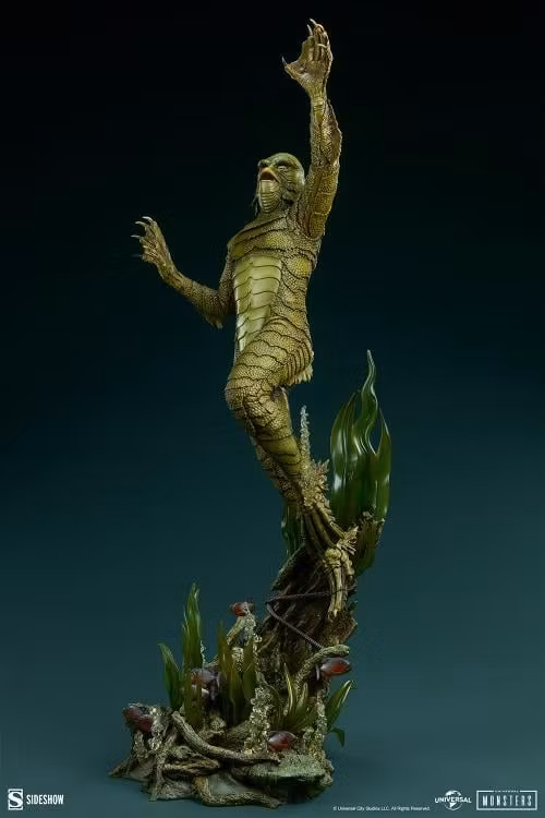 Genom att dyka ner i monsterfilmens djup vågar Sideshow upptäcka det som forskare och upptäcktsresande bara kallat Varelsen! Med måtten 31,5 hög, 13,18 bred och 12,8 djup visar Creature from the Black Lagoon Premium Format™ Figure Gill-Man som sträcker sig närmare flodytan. Denna amfibiska humanoid simmar uppåt genom grumligt vatten, genomskinliga växter och luftbubblor, omgiven av en stim röda pirayor. Nedanför snuddar fenorna vid den steniga flodbädden, i kontrast till det lockande torra landet ovanför. Vad — eller vem — kommer den nyfikna varelsen att möta när den träder fram i ljuset?