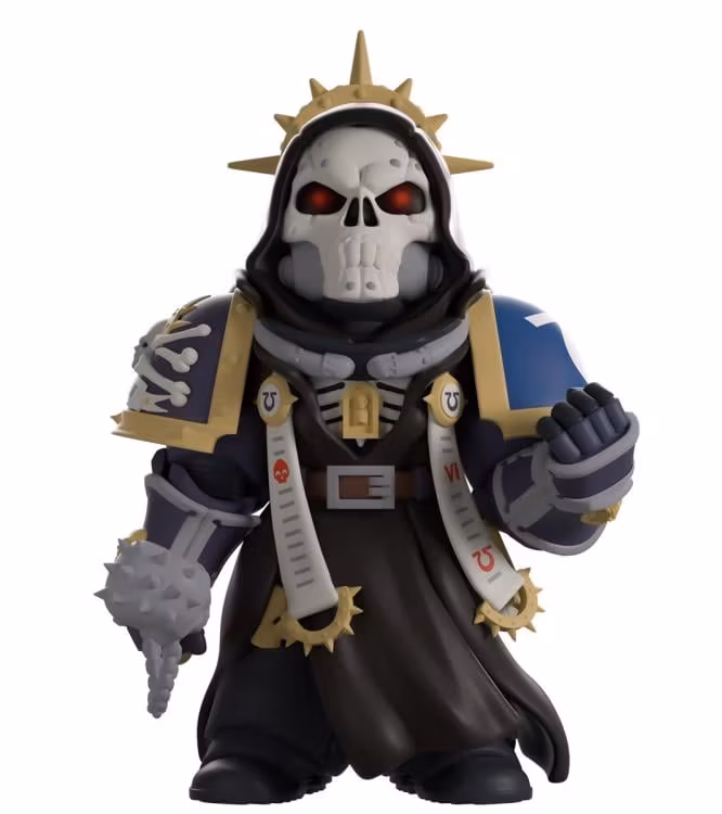 The Chaplain has arrived at Youtooz to inspire us for the next battle! Standing at 5.1 inches tall with a clenched fist raised to his front as he holds a skull mace in the other, red pupils shine through the dark sockets of their skull mask as a spiked golden circle rests behind their hooded head. With elegantly adorned pauldrons resting over a flowing black cloak, religious cloth hangs from his front as a red book is attached to his waist and power armor covers his arms.