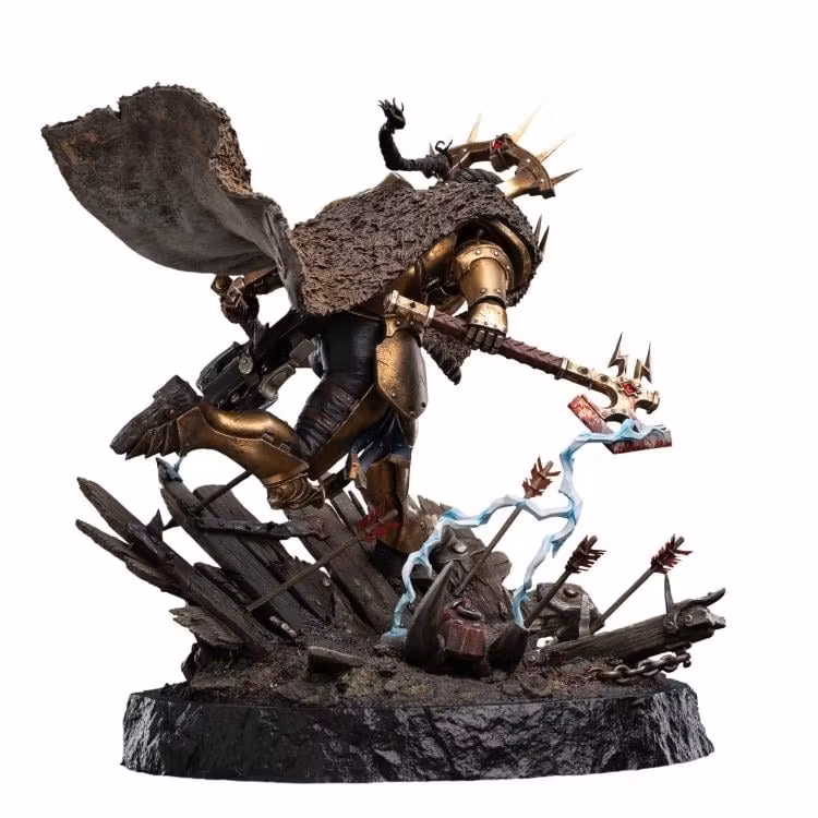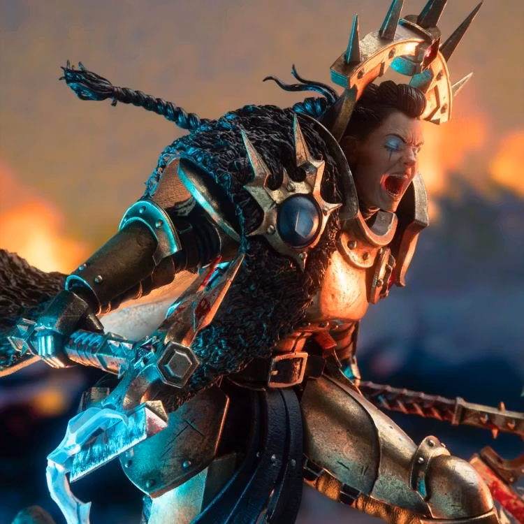 Captured in a single, wrathful instant, Neave Blacktalon storms into battle; golden armour ablaze, axes sparking with lightning, her war cry echoing across the battlefield. Every detail tells the story of Sigmar’s chosen assassin: the splintered war platform beneath her feet, the Orruk helm crushed into the dirt, the storm-forged fury carved into every line of her form.