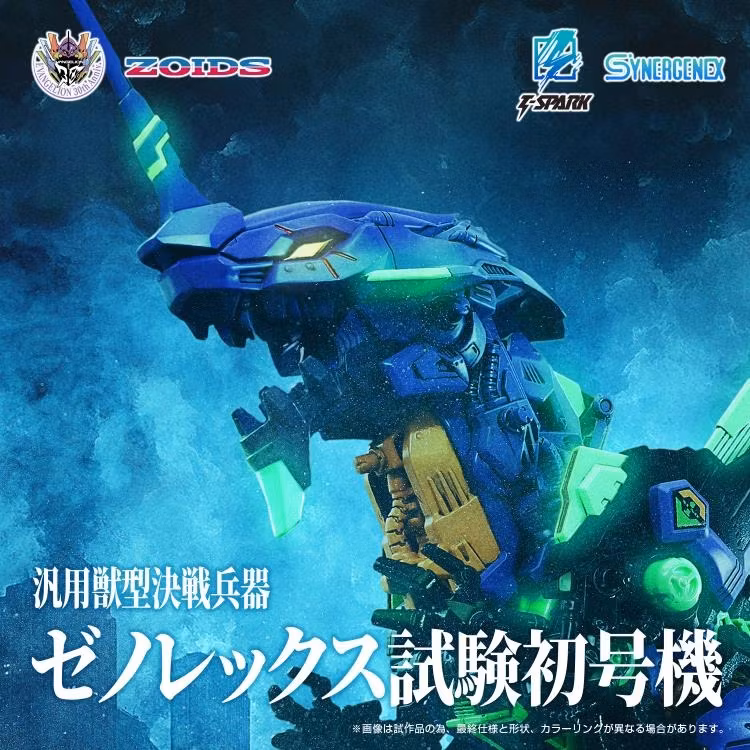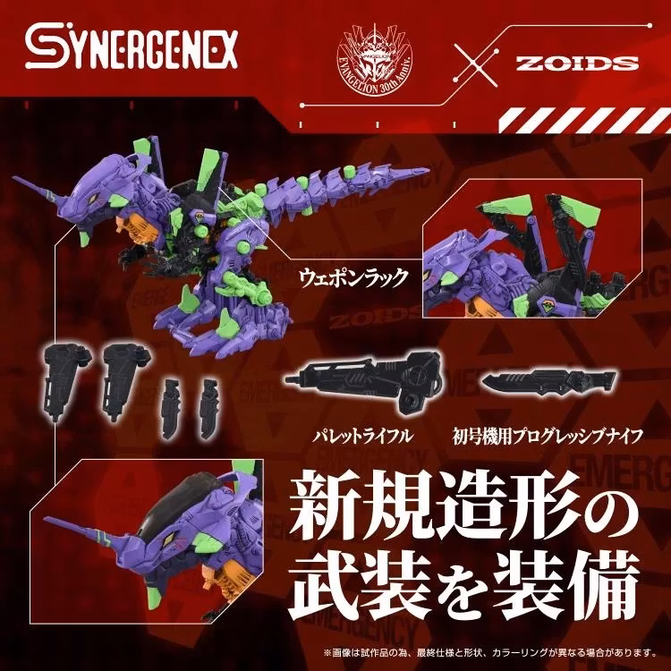 In this crossover, Zoids' Xenorex is customized by NERV to defend Tokyo-3 alongside Evangelion. The Xenorex is equipped with gear modeled after Evangelion Unit-02, enhanced with spot paint and marking details to improve accuracy in reproducing the Evangelion aesthetic. Newly added parts to the head, shoulders, and weapons are designed to enhance coordination with Evangelion in the imagined setting. Accurately replicate the Synergenex line’s signature silhouette and iconic MERC color palette.