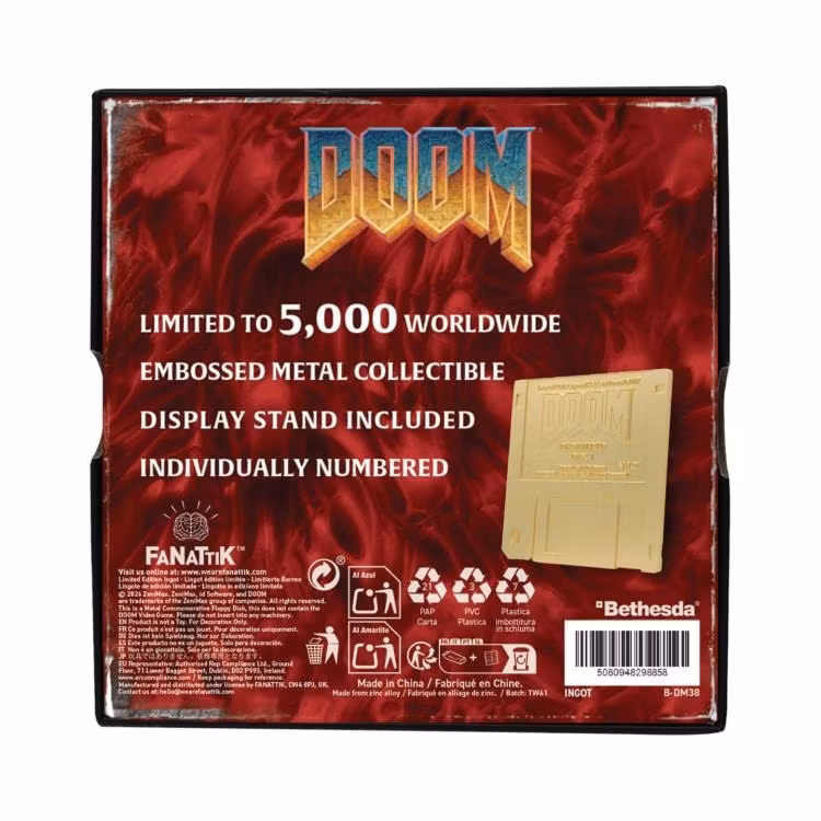 Vad är mer retro än föråldrad teknik? Till minne av den enkla 1,2 MB floppydisk som spelet ursprungligen släpptes på 1993, kommer denna begränsade upplaga av guldpläterad DOOM Floppy Disk Replica i en låda med originalkonstverket, har ett displayställ inkluderat och är individuellt numrerad som en av 5 000 världen över.